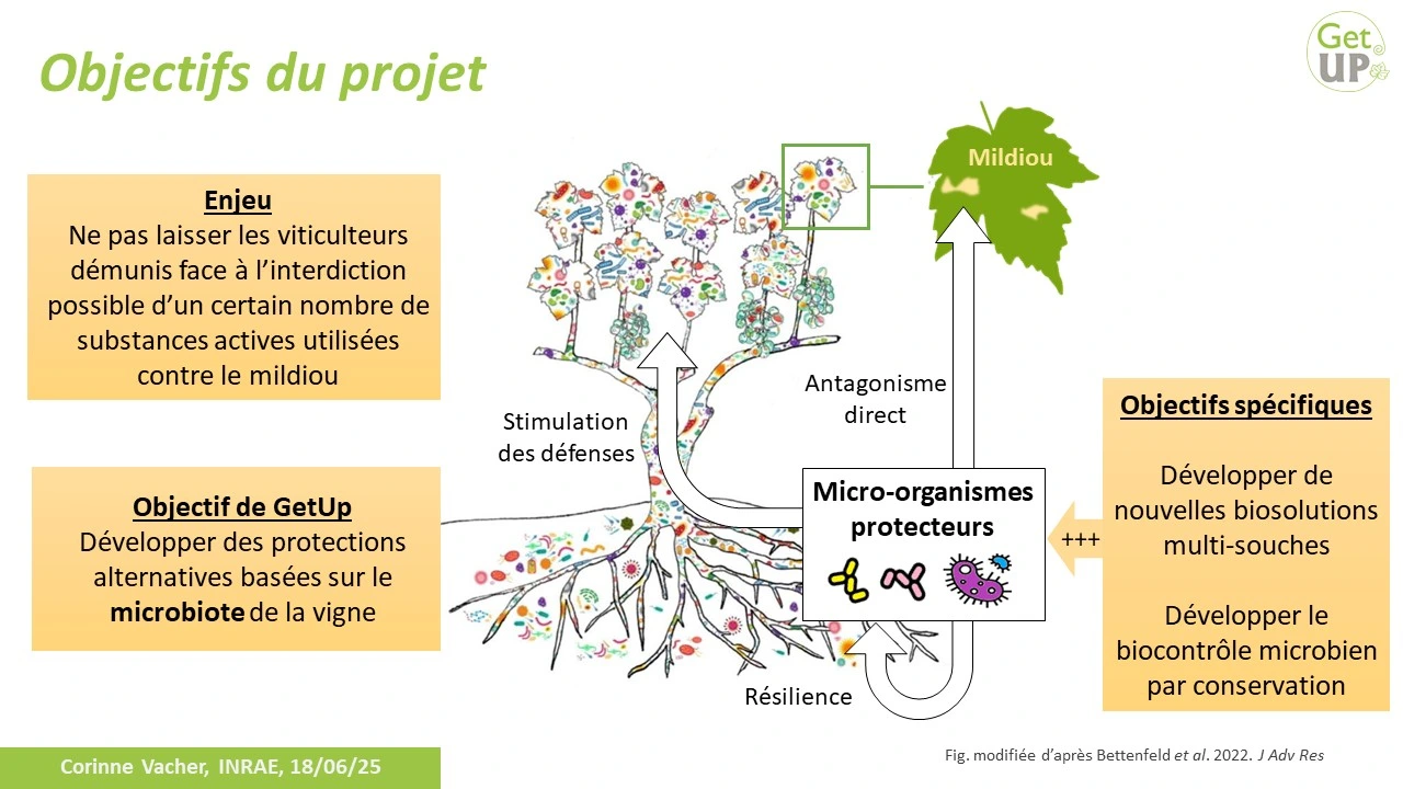 Le projet GetUp explore deux stratégies complémentaires de biocontrôle du mildiou, fondées sur la gestion du microbiote de la vigne :